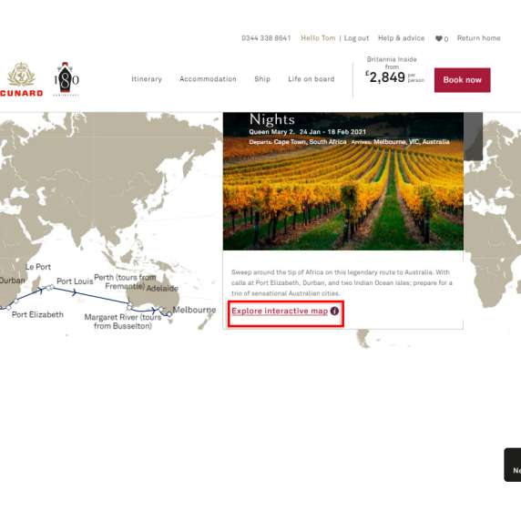 To enable, click 'Explore interactive map' and swipe up (if on a mobile device) or use the keyboard cursor keys to view the voyage's ports of call and days at sea.