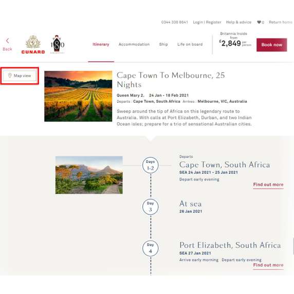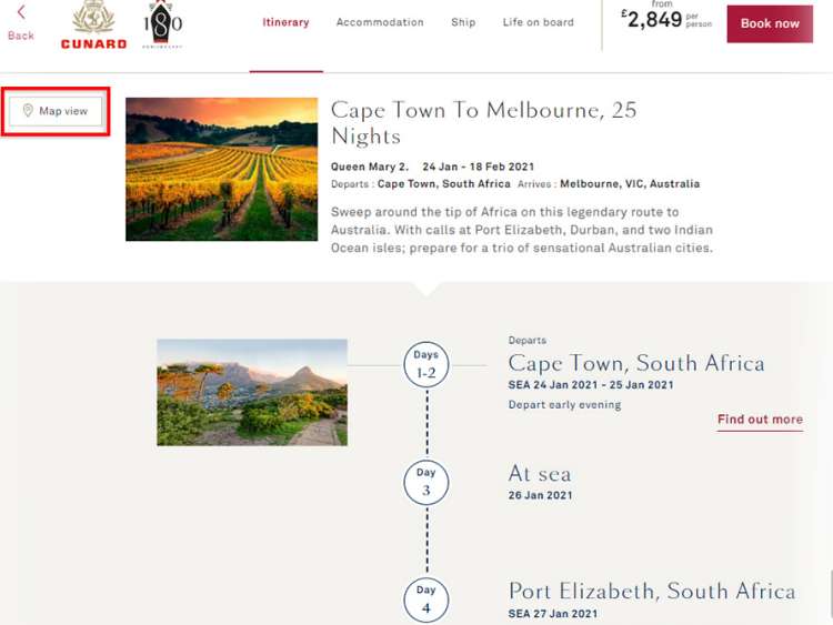 There are two options for viewing your selected voyage's itinerary: 'Map view' or 'List view'.