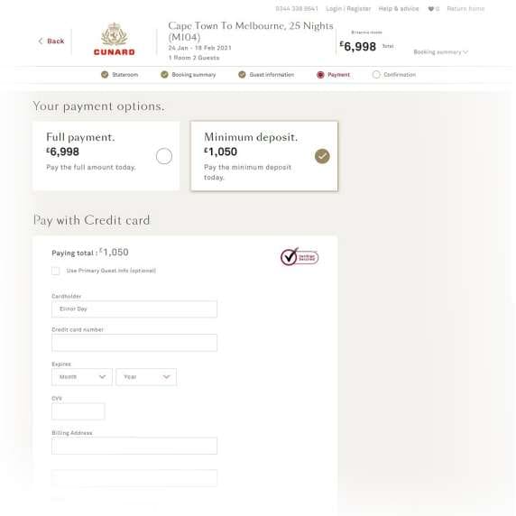 On the payment page you have the choice to pay the balance of your voyage in full, or pay a minimum (15%) deposit.