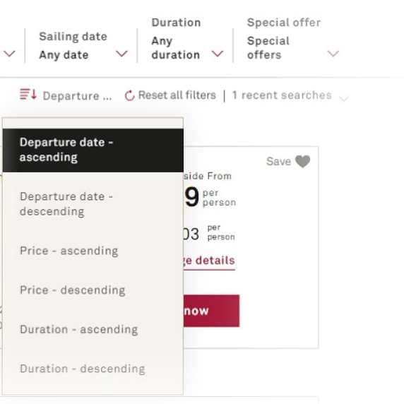 To refine your results further, click the ‘More filters’ dropdown on the search results page to filter by ports of call, price, ship and themes, and to filter out sold out voyages.