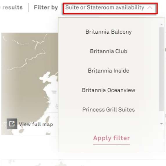 You can also filter your voyage results by accommodation preference, should you have a stateroom grade in mind. Simply select your choice from the drop-down menu and click 'Apply filter'.