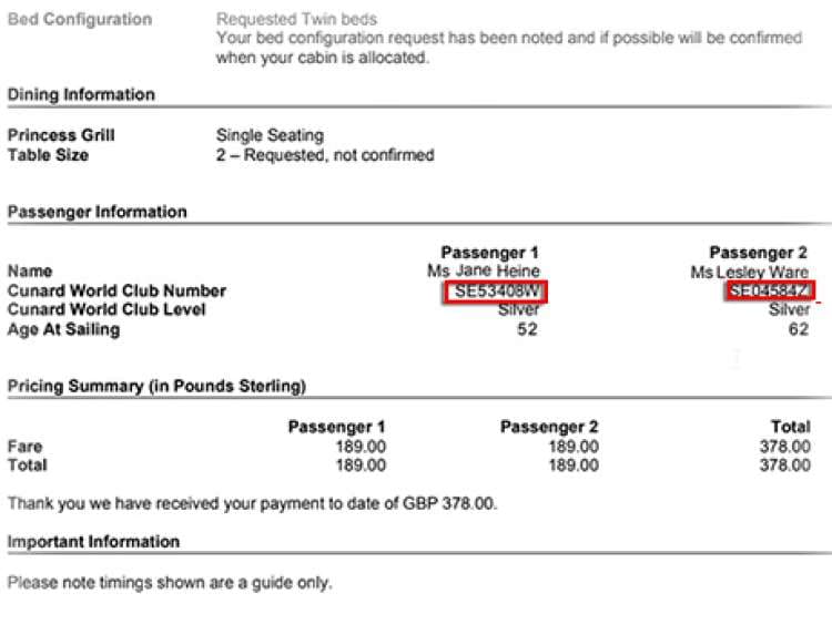 The FCC available to you is linked to your guest account by your unique Cunard World Club (CWC) membership number, which you will find on your booking correspondence from any previous voyage(s). CWC numbers are eight characters long and consist of two letters, five numbers, and a final letter. Helpful tip:To link your available FCC to your account and automatically apply it to your booking; log in to your My Account and enter your CWC number under the 'My details' section. Please note, it may take up to 30 minutes for your My Account to refresh and show your correct FCC balance.
