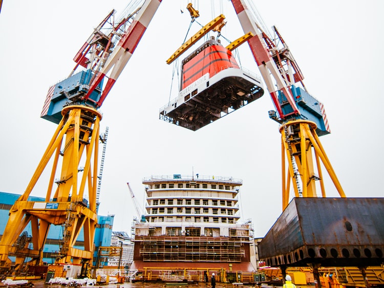 Queen Anne crowned with iconic red and black Cunard funnel in latest construction milestone at Fincantieri