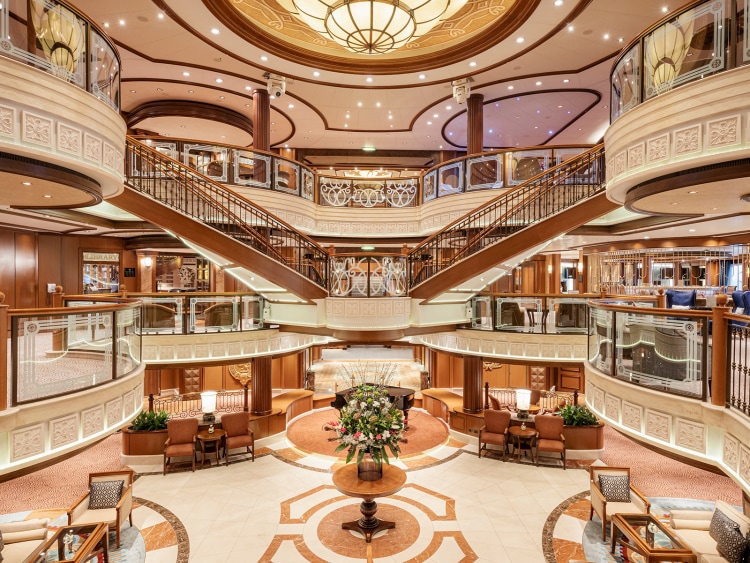 One of the most beloved features of Queen Victoria is her iconic Grand Lobby, a dazzling centrepiece adorned with a sweeping staircase, gleaming marble floors, and a magnificent chandelier. Here, guests gather to mingle, relax, and enjoy a drink, indulging in the timeless romance of ocean travel.
