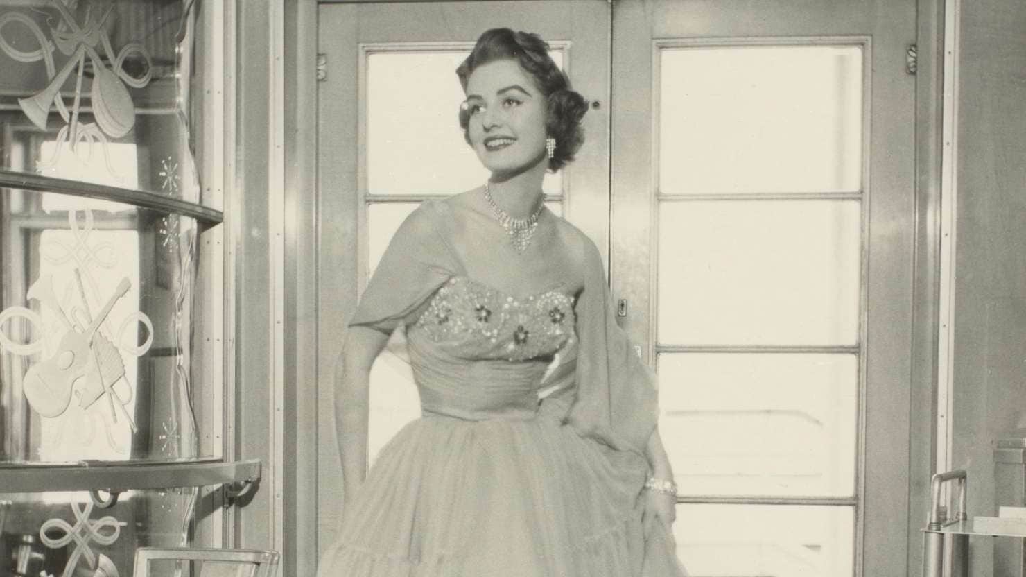 This photograph, taken in either the late 1940s or 1950s, was captured on board Queen Elizabeth while at Southampton Dock during a photoshoot by British fashion company Roecliff & Chapman. Specialising in women’s formal evening wear, they would advertise in high-end fashion magazines such as Vogue.
