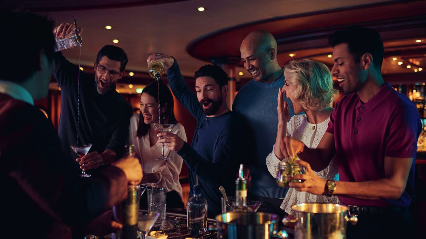 From cocktails on the lido deck to a nightcap before bed, you'll be able to find the perfect setting for your plans on board a Cunard Queen. Our venues, like the Commodore Club, the Golden Lion pub, and the Pavilion, blend a laidback atmosphere with classic Cunard charm, making the ideal venue for any occasion. Or you could explore our range of bars and lounges that are unique to your ship. For example, Bright Lights Society on Queen Anne pairs exotic drinks with enthralling entertainment, whereas Queen Mary 2 plays host to the only Laurent-Perrier Champagne bar at sea.