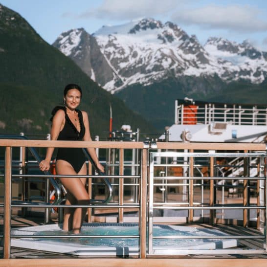 Queen Elizabeth's expansive decks are the perfect place to take in the Alaskan scenery. It's a unique vantage point offering a full view, from towering peaks to the waves beneath.