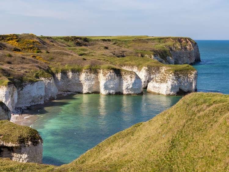 As you pass this stretch of the Yorkshire coast, your gaze will be drawn to the spectacular white chalk cliffs topped with grassland, guarded by lighthouses and home to squawking bird colonies.