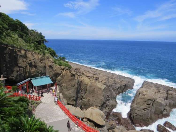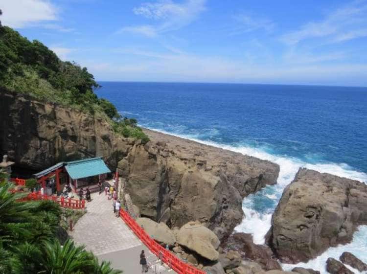 Then pay your respects next at the brightly painted Udo Jingu shrine. This mysterious storybook-like structure was built into a rugged cave, on a cliff overlooking a dramatic coastline.