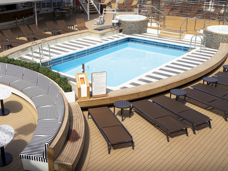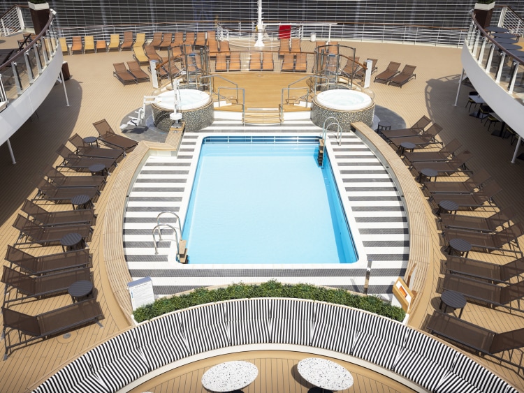 With impressive sea views and a prime position at the aft of the ship, the Panorama Pool Club is a vibrant destination in which to soak up the sunshine and make the most of luxurious days on board Queen Anne. Slide into a seat at the bar as DJs and live bands fill the air with the soundtrack to your vacation, lay back on your choice of sun lounger, or enjoy a refreshing dip in the cool waters of her monochrome-striped pool. Enjoy plenty of opportunities for al fresco nibbles throughout the day, and a full waiter service ensures a freshly shaken cocktail is always close to hand. You’ll also find a selection of seating styles from which to admire the sweeping views out to sea, and a canopy offering day-round shade if ever you’re seeking a little respite from the sun.