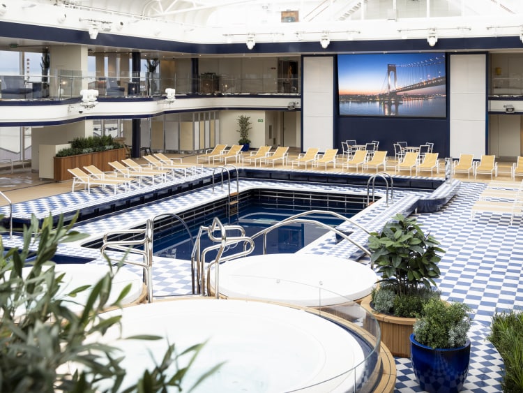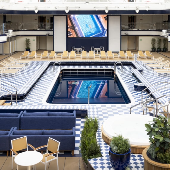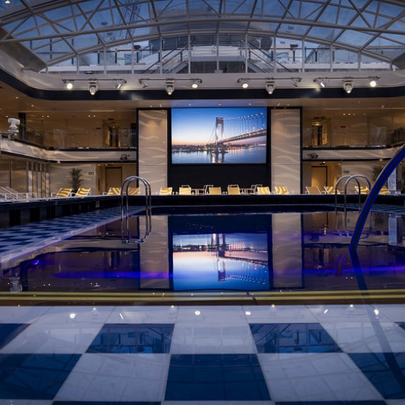 The Pavilion is a favorite venue on each one of the Cunard Queens, and Queen Anne is no exception. Find a wealth of pastime choices in this clever space that boasts a specially-designed glass dome roof that retracts in warmer climes. This is the ideal spot for getting lost in a book or enjoying a dip in the pool by day and for meeting new friends over a glass of wine in the evening. Romantic, dappled lighting and the moon and stars above work in perfect harmony to create an inviting setting for evenings spent on board. The central stage and screen is perfect for open-air theater, cinema screenings, live music, and more.
