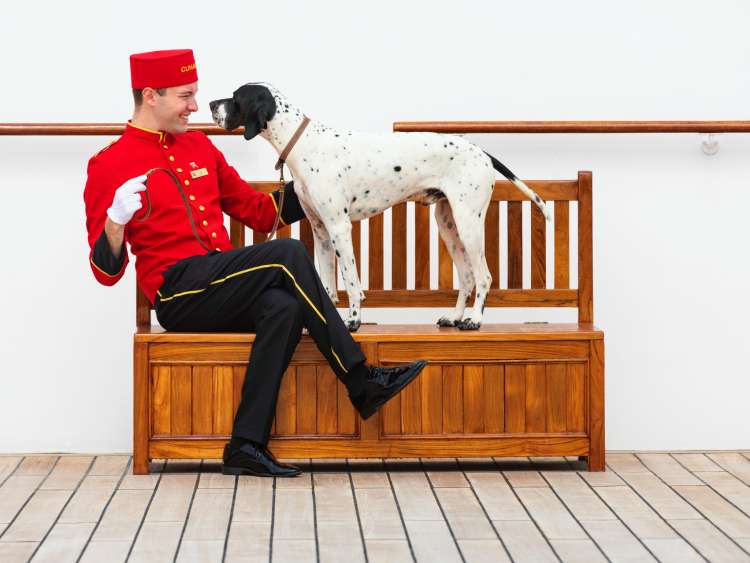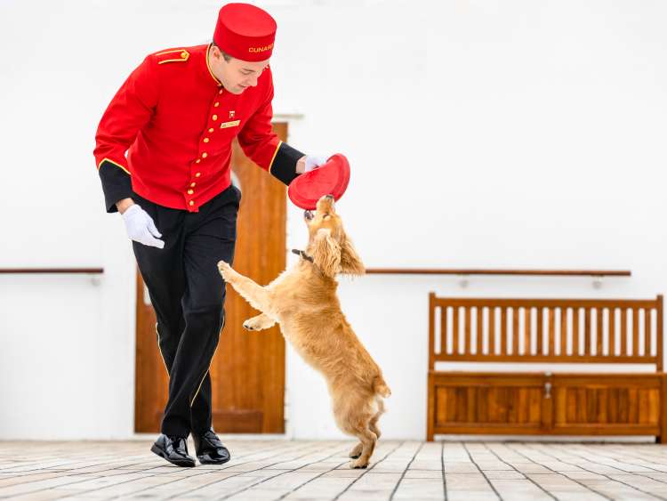 As a Cunard Kennels guest, your cat or dog will be treated to a complimentary portrait session with our ship’s photographer and Kennel Master. The Kennel Master will dress in our iconic red bellhop uniform for the photoshoot, and we’ll provide plenty of props for your pet to wear and play with, including a Queen Mary 2 life ring, a Cunard jacket, and a miniature bellhop hat.