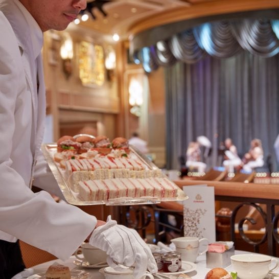 Cunard invites travelers to embrace the daily British ritual of Traditional Afternoon Tea, presented in the Queens Room each day from 3:30 to 4:30 p.m. White-gloved servers offer fine teas, as well as a menu of light bites including finger sandwiches, buttery pastries, and signature Cunard scones with Devonshire clotted cream and strawberry jam, all served on fine bone china.