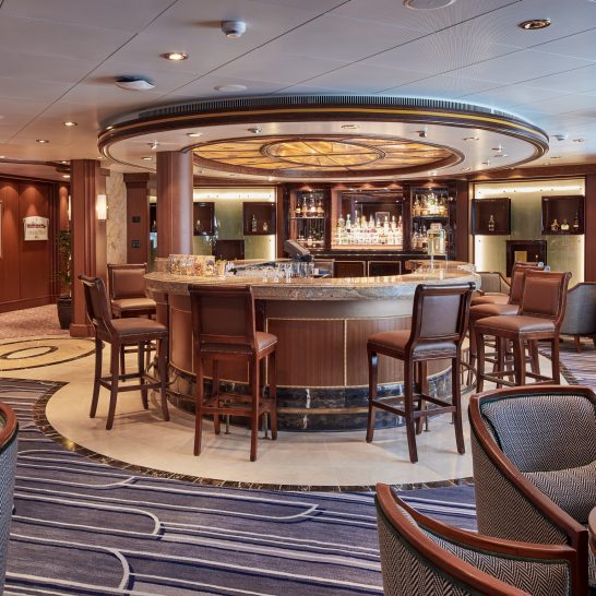 The ambiance of the Yacht Club on Queen Elizabeth and Queen Victoria shifts from day to night as resident DJs keep the party going. Enjoy top-shelf tipples, including a special World of Whiskies menu featuring selections from Japan, Scotland, Ireland, and the U.S., as well as an array of rejiggered takes on the classic old-fashioned. Choose from the Sailor’s Signal, made with bourbon, a smoky Lapsang souchong tea- and honey-infused syrup, and handcrafted bitters, or the Hello Maple, mingling Canadian whisky, maple syrup, and Angostura bitters.