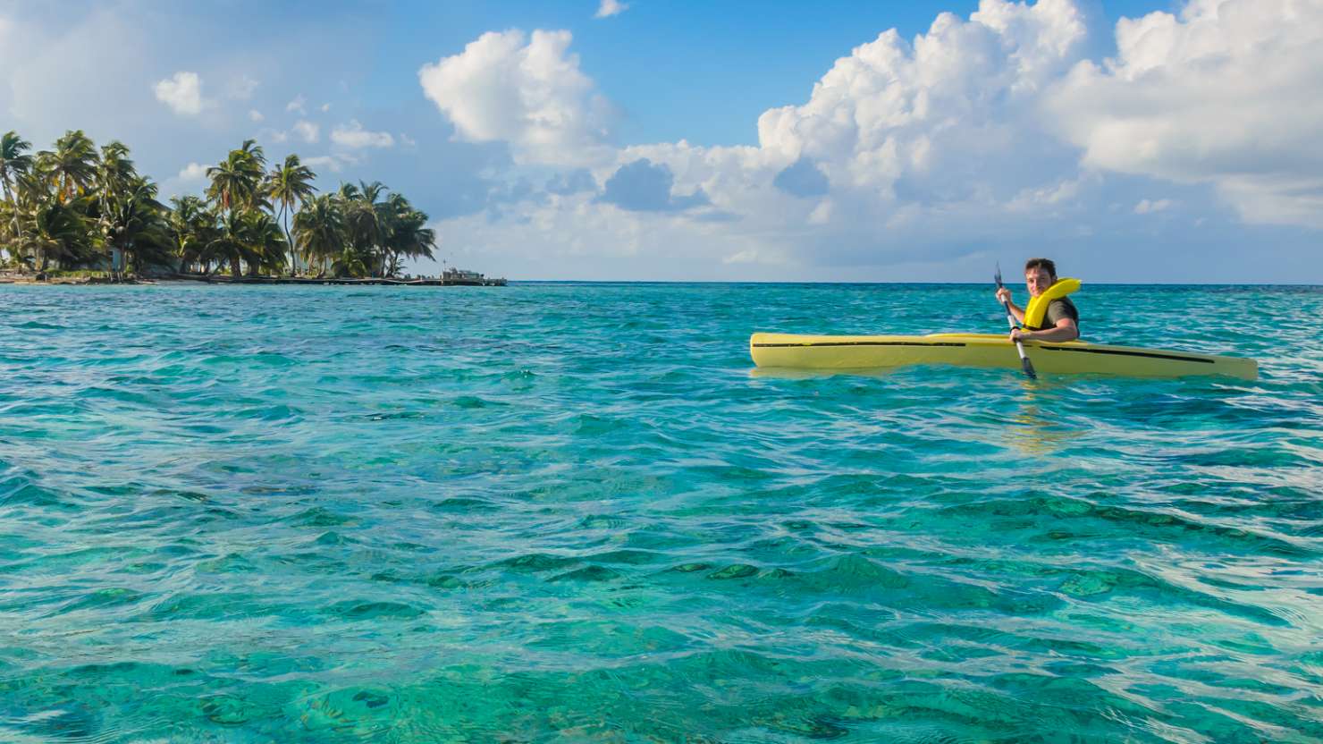 A man kayaks over clear Caribbean waters off the coast of Belize