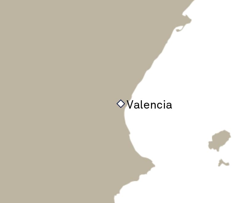 Valencia lies on Spain’s south-eastern coast, where the Turia River meets the Mediterranean Sea.