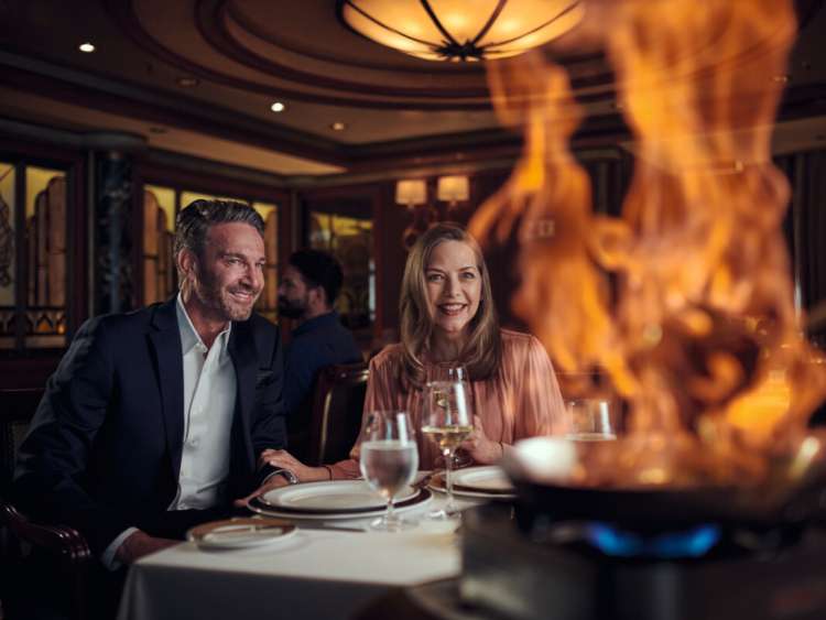 白い手袋をはめたウェイターがサーブするシャンパン、花束、上質なお料理の数々。キュナードの船上でのお祝いは、これがスタンダードです。