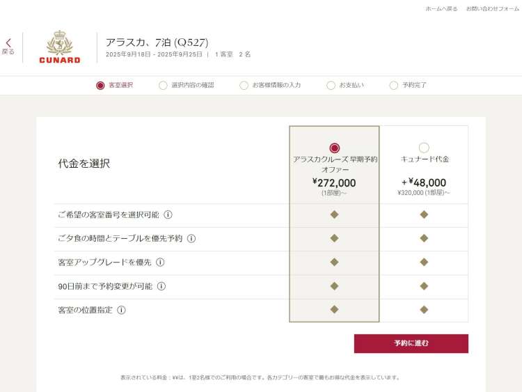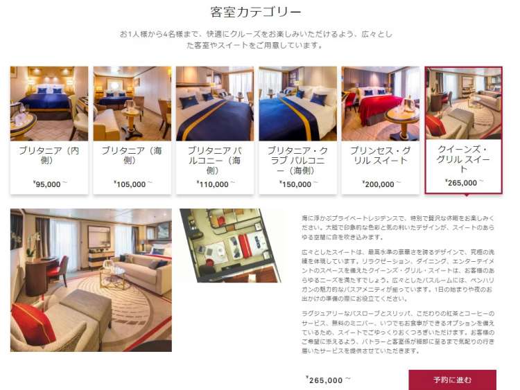 人数を選択後に、[客室選択に進む] をクリックして、ご予約可能な客室カテゴリーをご確認ください。客室の画像をクリックすると、画像ギャラリーにアクセスして、お部屋の写真やレイアウトをご覧いただけます。 ご希望のカテゴリーが決まったら [代金の選択に進む] をクリックしてください。キュナードのサポートと医療に関するポリシーにより、電動カート等の電動モビリティ・デバイスをご利用のお客様は、車いす対応の客室またはスイートのみご予約いただけます。