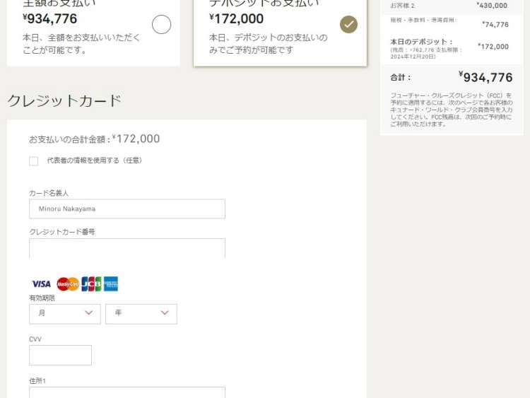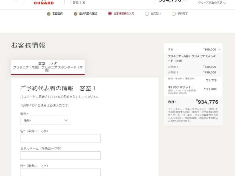 お客様情報の入力画面では、ご予約される方全員のフルネームや生年月日など、個人情報の入力が必要です。ご予約完了後にご乗船者名を変更することはできません。ご乗船者の正確な情報をお手元にご用意ください。 過去にキュナードのクルーズに乗船されたことのある場合は、キュナード・ワールドクラブ番号を入力してください。 フューチャー・クルーズ・クレジット(FCC)をお持ちの方で、こちらに番号の入力がない場合は、FCCはご使用いただけません。お支払い方法とデポジット