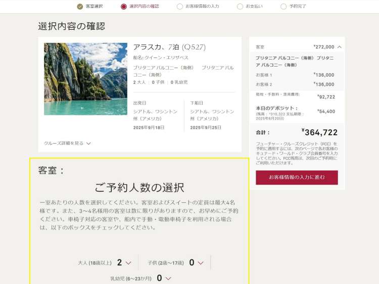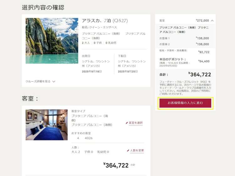 お支払いに進む前に、代金の内訳とクルーズの概要が表示されます。ご予約内容をご確認のうえ、「お客様のクルーズに関する重要な情報」をお読みになりボックスにチェックを入れてください。その後、[お客様情報の入力に進む] をクリックしてください。また、こちらのページでは、客室カテゴリーや予約人数の最終変更が可能です。ご希望の場合は、客室セクションの [客室を選択] または [人数を変更] をクリックしてください。