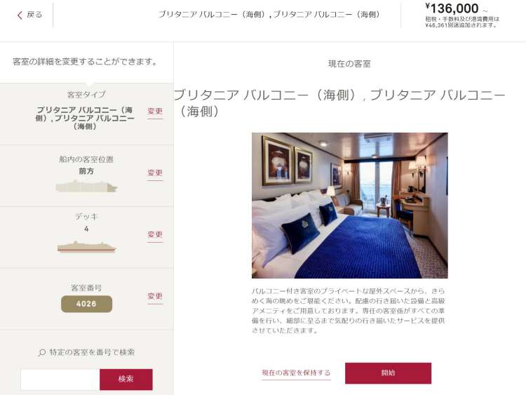 こちらのページでは、お客様のニーズに応じて客室タイプ、船内の位置、デッキ、客室番号を選び、カスタマイズすることができます。また、特定の客室番号での検索も可能です。選択済みの客室で確定する場合は、[現在の客室を保持する] をクリックしてください。人数の変更