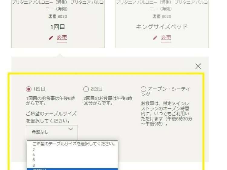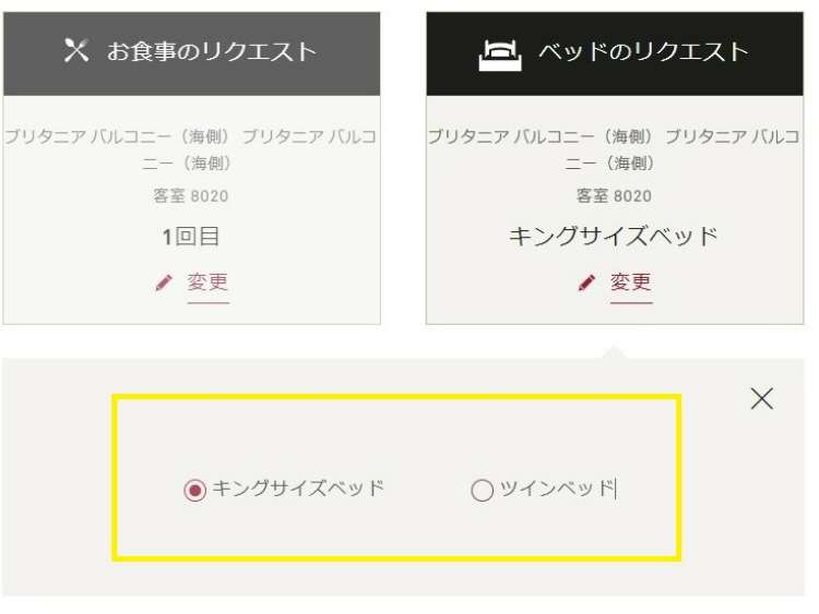 予約完了の画面では、ダイニング、ベッド、アップグレードに関するリクエストを行うことができます。