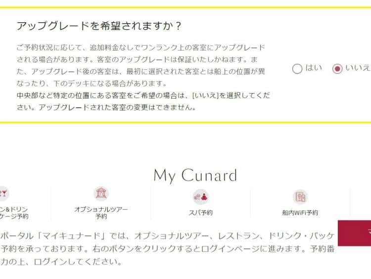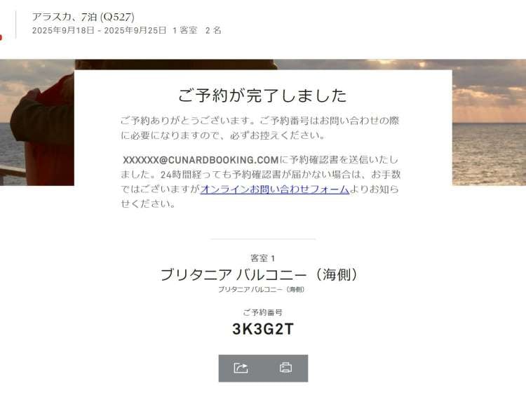 お手続きが完了すると、お客様のご予約番号をご案内いたします。また、これ以降は予約番号を使用してマイキュナードへアクセスできるようになります。