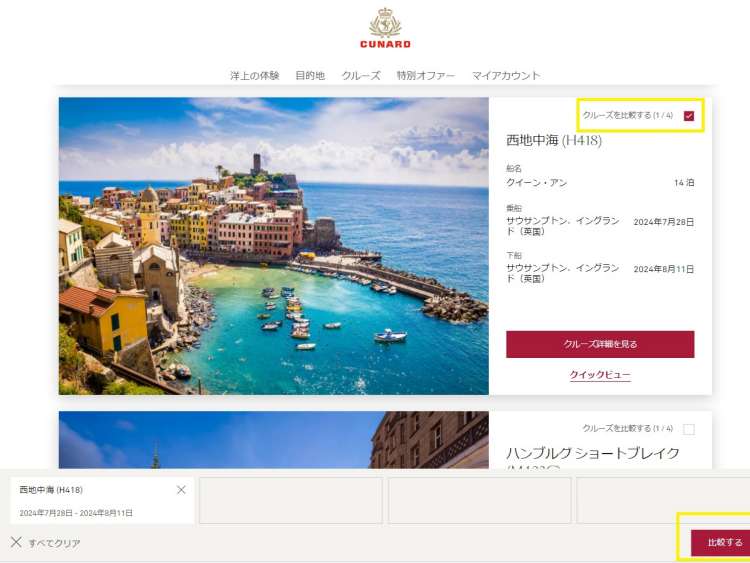クルーズの比較機能を使うと、最大4つのクルーズを比べることができます。比較するには、ご希望のクルーズの右上にあるボックスにチェックを入れてください。選択が完了したら、画面右下の [クルーズを比較する] をクリックすると比較表が表示されます。旅程の表示 & 客室カテゴリー