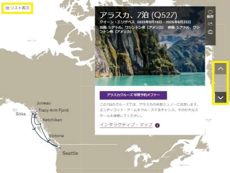 クルーズの旅程は、インタラクティブ・マップ表示またはリスト表示の2つの方法で見ることができます。 ディフォルトはマップ表示で設定されています。クルーズ詳細の右側にある上下の矢印をクリックすると、各コースの旅程をインタラクティブ・マップで見ることができます。また、画面左上の [リスト表示] をクリックすると画面の切り替えが可能です。寄港地や船上アクティビティ等に関する情報は、[詳しく見る] をクリックしてください。