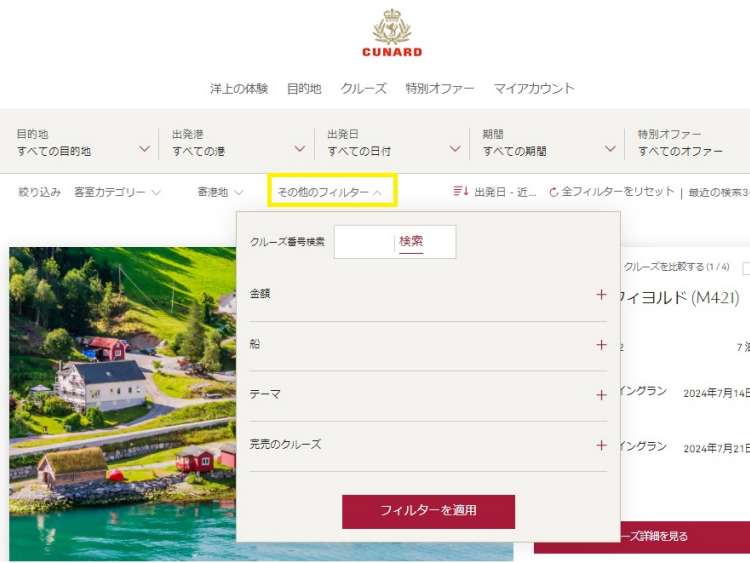 画面にはご希望の検索条件に合ったクルーズが表示されます。検索結果をさらに絞り込むには、検索バーの下にある、客室カテゴリー、寄港地、その他のフィルター(金額、船、テーマ)から選択してください。