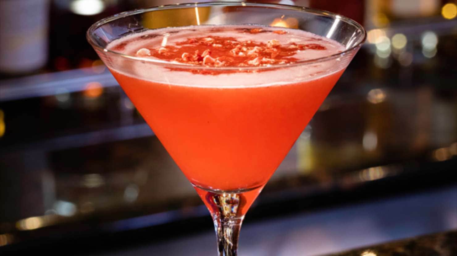 Finely strain into a martini glass and decorate with dried raspberries or a garnish of your choice.